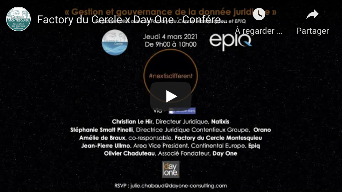 La Factory du Cercle, en partenariat avec DayOne et Epiq a proposé une conférence autour du vaste sujet de la gestion et de la gouvernance de la donnée juridique. Le Big Data ne s’arrête pas aux portes de nos services et nous devons nous aussi faire face à une forte augmentation des données que nous devons exploiter. Cette conférence était l’occasion de bénéficier du partage d’expérience des interlocuteurs, vous pouvez la re-visionner ci-dessous :