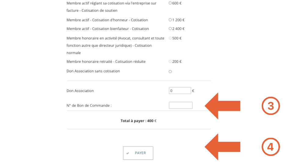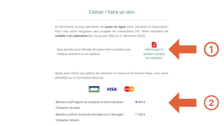 2) Si vous souhaitez régler votre cotisation par carte bancaire en ligne, sélectionnez le montant correspondant à votre statut (membre actif, membre honoraire, etc..)