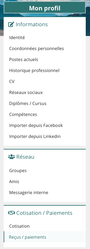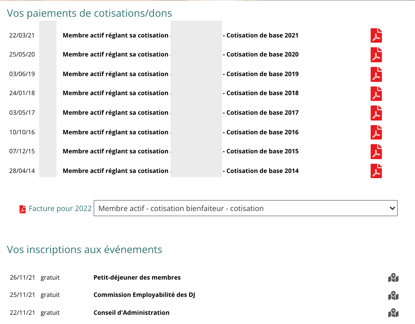 > Dans la partie Cotisation/Paiements en cliquant sur Reçus/Paiements, retrouvez l'ensemble de vos reçus de factures concernant les paiements de cotisations/dons ainsi que les inscriptions aux événements. Vous pouvez également générer votre Facture pour 2022 en sélectionnant votre statut dans le menu déroulant