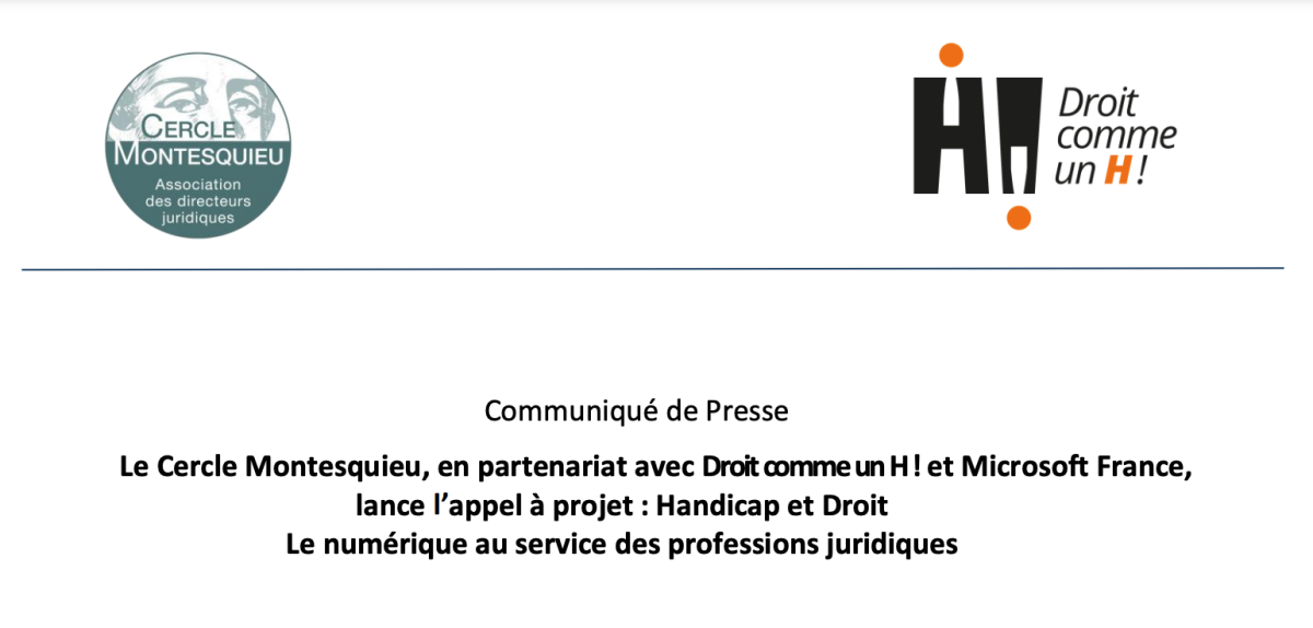 Au lendemain de la Semaine Européenne pour l’Emploi des Personnes Handicapées, le Cercle Montesquieu lance un appel à projet Tech for Legal Accessibility - Le numérique au service des professions juridiques, en partenariat avec Droit comme un H! et Microsoft France. L’objectif de cet appel à projet est d’avoir un impact positif sur la formation, l’emploi et les usages des solutions numériques au bénéfice de tous les juristes (avocats, juristes d’entreprise) et plus particulièrement les juristes en situation de handicap.